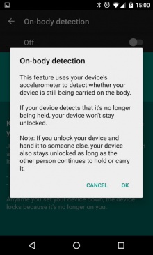 A Google está lançando um novo modo de bloqueio inteligente chamado detecção ao corpo. O recurso, descrito nas telas abaixo, usa o seu acelerômetro para descobrir quando o dispositivo está na sua mão ou no bolso, e bloquear quando não estiver em uso. A ideia é se você deixar o seu telefone parado em uma mesa ou esquecê-lo em algum lugar, ele irá travar, impedindo que ladrões tenham acesso facilmente aos seus dados.