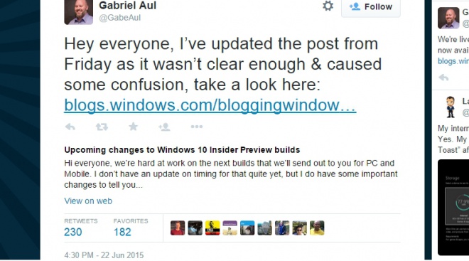 A publicação foi atualizada pelo menos umas três vezes para que as confusões fossem esclarecidas e, em uma mensagem no Twitter (imagem acima), Aul deu a entender que finalmente esclareceu todas as dúvidas sobre as únicas maneiras de usuários insiders da Microsoft conseguirem uma cópia legítima do Windows 10, vamos a elas.