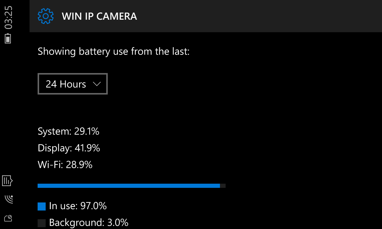 Na imagem acima, podemos ver o uso de bateria do aplicativo Win IP Cam, que gastou boa parte do seu consumo de bateria com a tela. Outras proporções quase idênticas foram usadas com o sistema e o WiFi.